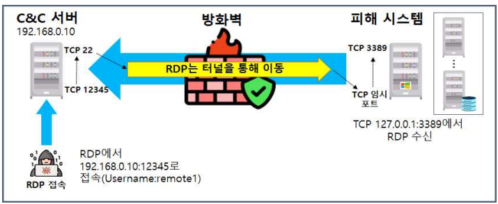 - 피해 서버의 포트포워딩 설정을 통해 공격자가 차단된 RDP 포트를 우회하여 원격접속하는 공격